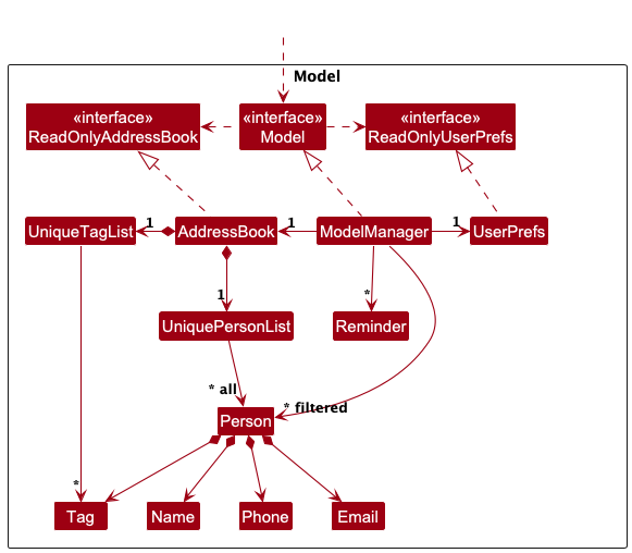 PersonandTagobjects (e.g., results of a search query) as a separate filtered list which is exposed to outsiders as an unmodifiableObservableList<Person>andObservableList<Tag>that can be ‘observed’ e.g. the UI can be bound to this list so that the UI automatically updates when the data in the list change. - stores a